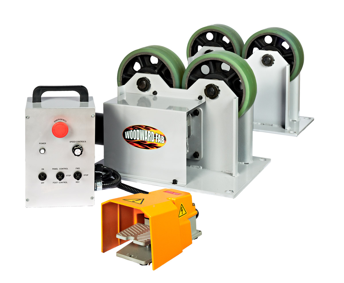 Our Turning Roll set is a great compliment to any pipe, tube, or tank fabrication system. Assists the fabricator in slowly rotating your round material to easily control the speed and pace for welding activities. Use the foot pedal control or set the speed using the included control panel pendant. The fabricated steel frame is sturdy and strong to provide years of dependable service.