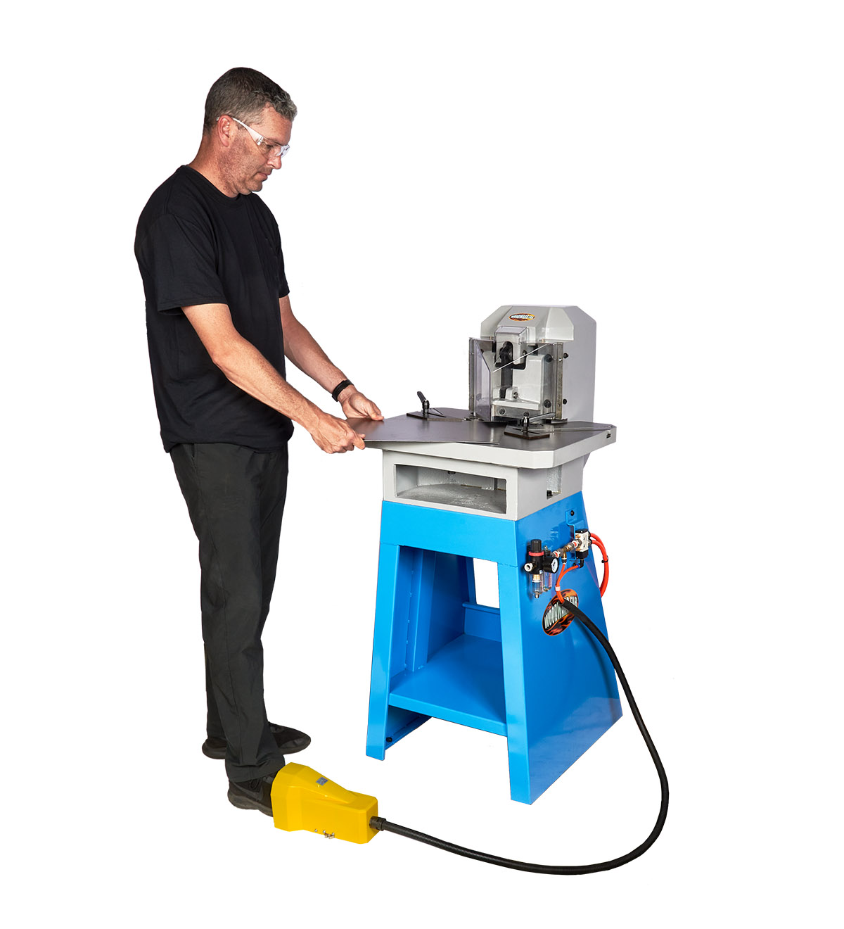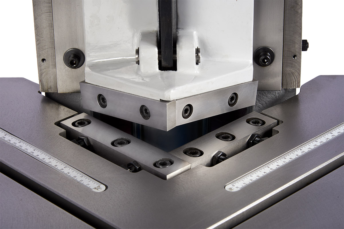 Ideal for making perfect 90 degree notches in sheet metal up to 11 gauge. Features 5″ high chrome blades with adjustable gap for precise cutting a wide range of thicknesses. Notches larger than 5″ x 5″ can be made in multiple hits. Massive all cast iron frame that just will not flex or deflect. Large cast iron table with both inch and metric scales. Blade stops for repetitive work. Includes air regulator, filter, foot control with operation up to 50 strokes per minute and clear safety guard.